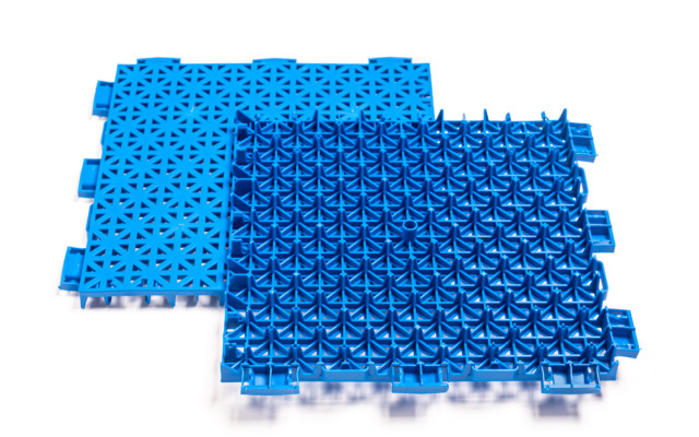 System amortyzatorów bocznych umożliwia rozszerzanie i kurczenie się na skutek działania ciepła, chroniąc przed odkształceniami powierzchni. System słupków zapewnia właściwą amortyzację nawierzchni, współczynnik tarcia i chroni stawy użytkowników. Specjalnie zaprojektowana otwarta siatka (ażurowa) zapewnia szybkie odprowadzanie wody.