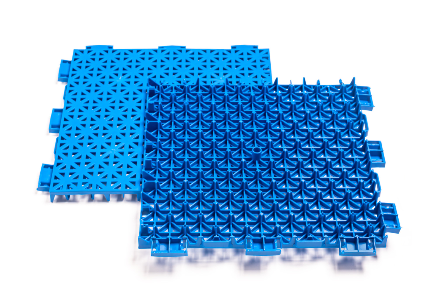 System amortyzatorów bocznych umożliwia rozszerzanie i kurczenie się na skutek działania ciepła, chroniąc przed odkształceniami powierzchni. System słupków zapewnia właściwą amortyzację nawierzchni, współczynnik tarcia i chroni stawy użytkowników. Specjalnie zaprojektowana otwarta siatka (ażurowa) zapewnia szybkie odprowadzanie wody.