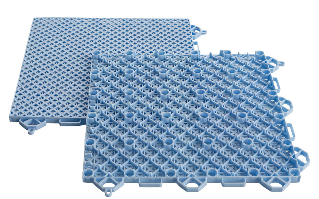 Polipropylenowa nawierzchnia modułowa, wytwarzana przez formowanie wtryskowe w postaci odpornych na uderzenia płytek z tworzywa sztucznego.