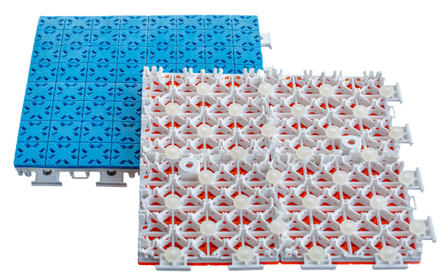 Specjalistyczna mieszanka kopolimeru polipropylenowego odpornego na uderzenia oraz elastomer poprawiający amortyzację pionową (wynoszącą 30%) i współczynnik tarcia. Dodatek absorberu UV oraz antyutleniacza zapewnia ochronę przed utratą koloru, degradacją i utlenianiem tworzywa sztucznego. Płytki posiadają także dodatki antystatyczne redukujące nagromadzenie ładunków elektrostatycznych na użytkownikach boisk.